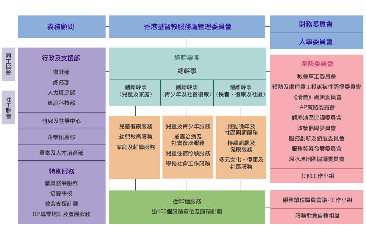 | 職員: | 翟冬青女士 - 總幹事 陳頌皓女士 - 副總幹事(長者、復康及社區) 李紫薇女士 - 副總幹事(兒童及家庭) 謝可儀女士 - 副總幹事(青少年及社會復康) |