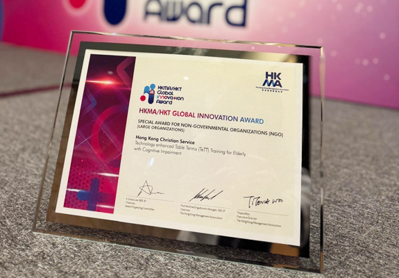 本處持續照顧及健康服務的「科技輔助乒乓球訓練(TeTT)」計劃獲「HKMA/HKT環球創新獎2024」─非政府機構特別獎(大型機構)。主辦單位HKMA共收到270多份參賽項目。頒獎禮於「HKMA環球創新日」上舉行 ,嘉許各行各業、不同界別的機構在創新領域的傑出成就。「科技輔助乒乓球訓練(TeTT)」計劃透過靈活善用不同科技,結合專業介入理論,為患認知障礙症長者提供系統性的乒乓球訓練,提升其認知能力,避免他們因身體及認知缺損而無法享受運動的樂趣及好處。